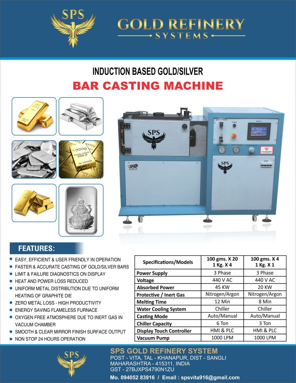 We are SPS Gold Refinery Systems, a leading Manufacturer, Exporter, and Supplier from India, offering the SPS Dual Mold Induction Bar Casting Machine. Our SPS-CM100GMx2 / CM500GMx2 / CM1KGx2 models provide casting capacity options of 100 Grams X 2 Bars. This induction-based bar casting furnace operates on a 3 Phase power supply with a frequency of 50/60 Hz. Featuring air cooling and chamber cooling with nitrogen for an inert atmosphere, the machine ensures precise temperature control with a PID controller. Upgrade your casting process with our reliable and efficient SPS Dual Mold Induction Bar Casting Machine.